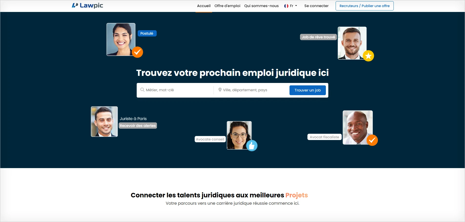 LAWPIC est un site qui réunit les employeurs et les candidats du domaine de la justice, du juridique et de la loi. LAWPIC est également le premier portail d’emploi juridique en France propulsé par l’IA. Vous souhaitez trouver rapidement le candidat idéal, vous avez besoin d’une visibilité maximale pour votre annonce ? LAWPIC connecte les meilleurs talents du juridique à travers toutes les régions de France.