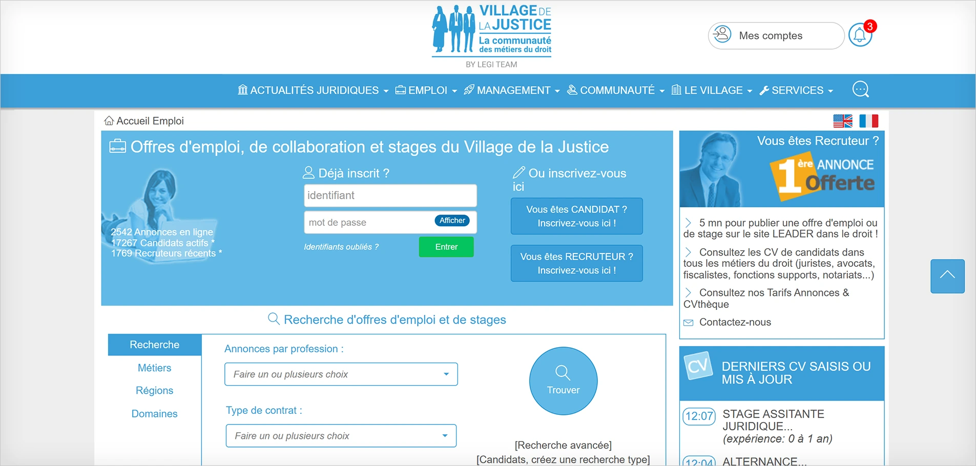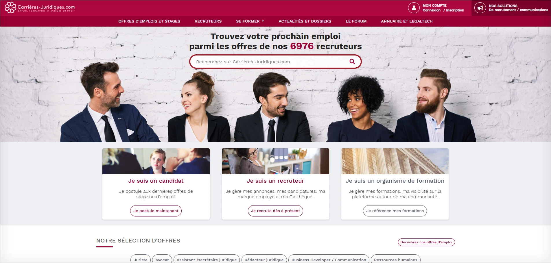 Le site comptabilise à ce jour plus de 100 000 candidatures pour un total d’un million d’offres d’emploi. Si vous recherchez un emploi d’avocat des affaires, un CDI de juriste dans le droit social ou encore votre premier stage en cabinet d’avocats, vous ne devez pas passer à côté de carrieres-juridiques.com L’utilisation fonctionne gratuitement et sans abonnement, votre CV est disponible auprès des plus grands recruteurs du juridique.